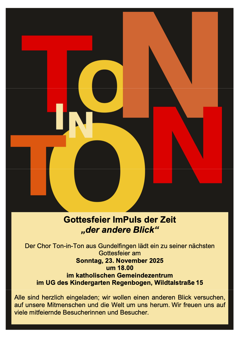 Der Chor Ton-in-Ton aus Gundelfingen unter der Leitung von Peter Bäumle lädt herzlich ein zu seiner nächsten inhaltlich und musikalisch gestalteten Gottesfeier am Sonntag, 23. November 2025 um 18.00 Uhr im katholischen Gemeindezentrum in Gundelfingen (Untergeschoss des Kindergarten Regenborgen, Wildtalstr. 15, Zufahrt über Kandelstraße/Krummackerweg). Alle sind herzlich eingeladen: wir wollen diesmal einen anderen Blick versuchen, auf unsere Mitmenschen und die Welt um uns herum. Bitte merken Sie sich den Termin schon einmal vor. Wir freuen uns über viele Mitfeiernde, ob mit oder ohne Religionszugehörigkeit.